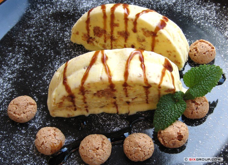 Das Parfait mit der Frischhaltefolie aus der Form heben. In Scheiben schneiden und mit frischen Früchten oder Karamellsauce anrichten.