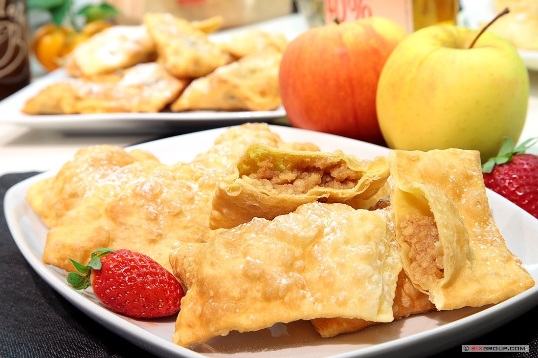 Den Teig halbieren, etwas flach drücken, mit Mehl bestäuben und mit der Nudelmaschine ausrollen. Diesen Vorgang so lange wiederholen, bis der Teig ganz dünn ist. Auf die Hälfte des Teigblattes kleine Häufchen der Apfelfüllung geben. Den Rand des Teigblattes mit Eiweiß bestreichen und die Teigblätter zusammenfalten. Mit der Hand die Ränder andrücken, mit dem Teigrad Krapfen abradeln und auf ein Tuch geben.