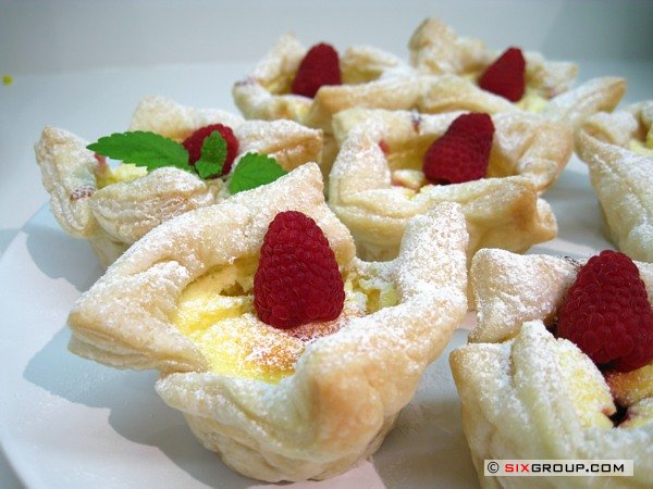Beeren, 1EL Zucker und Stärke pürieren. Eier trennen. Eigelbe, Zucker, Quark und Zitronensaft verrühren. Puddingpulver und Milch unterrühren. Teigscheiben zu einem Rechteck (44x33cm) ausrollen. 12 Quadrate (11x11cm) ausschneiden. In die Mulden einer Muffinsform legen.