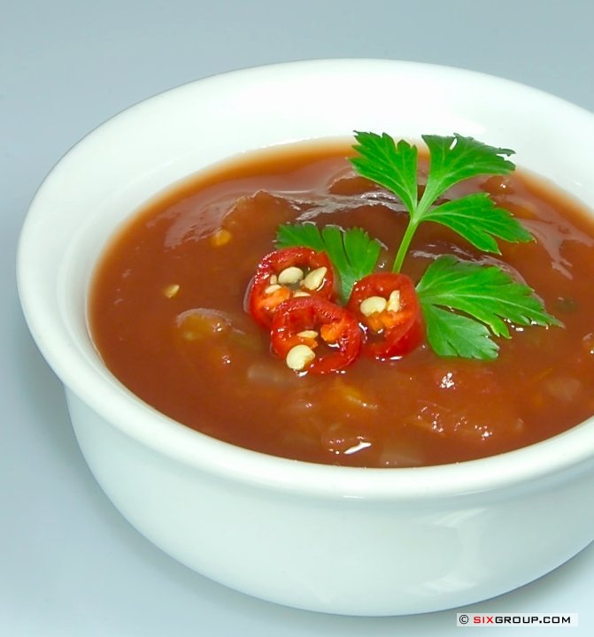 Pelati mit Ketchup, Essig, Zitronensaft, Öl und Sojasauce gut vermischen. Mit etwas Zucker, Pfeffer, Salz und Tabasco abschmecken. Chilischote längs halbieren und die Kerne entfernen.