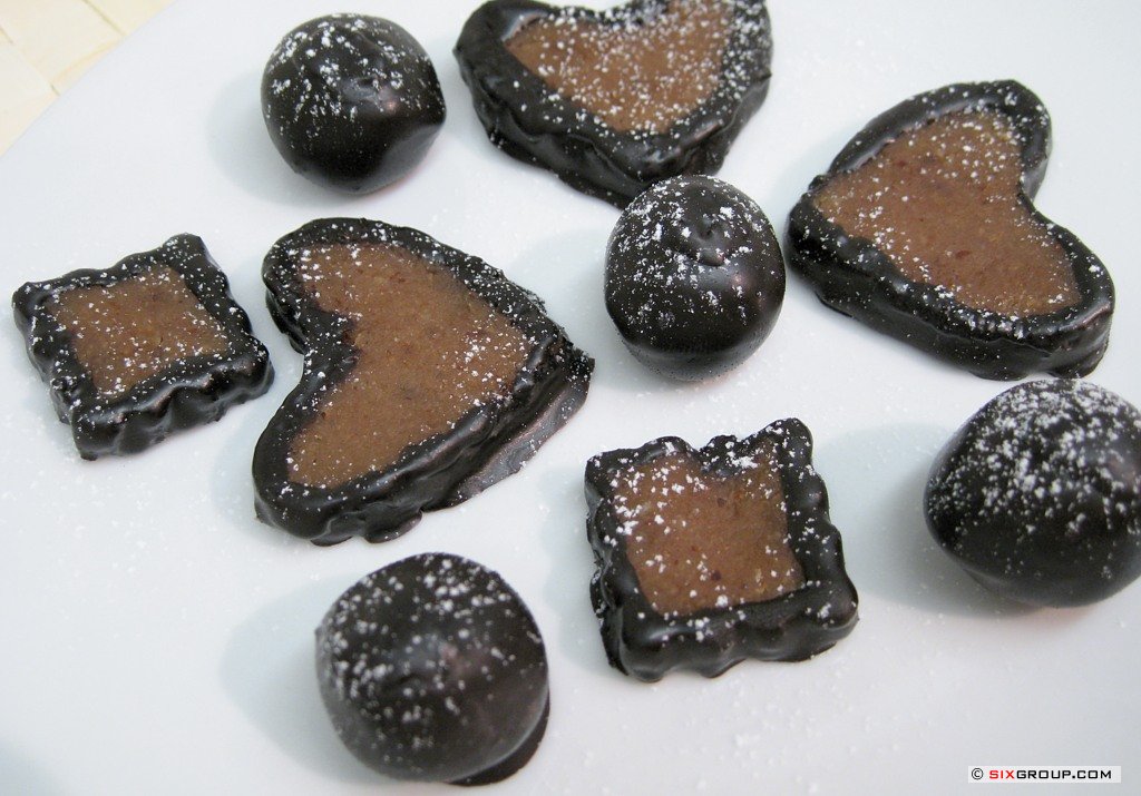 Konfekt mit Puderzucker bestäuben und nach Belieben in Pralinenförmchen setzen.