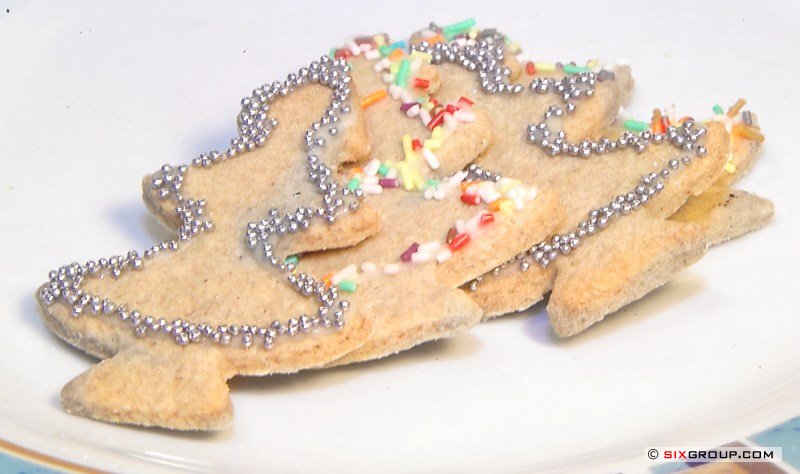Puderzucker mit Milch zu einem Guß verrühren und in einen kleinen Gefrierbeutel füllen. Eine kleine Ecke abschneiden und die Tannen mit dem Guß, Zuckerperlen und -streusel verzieren.