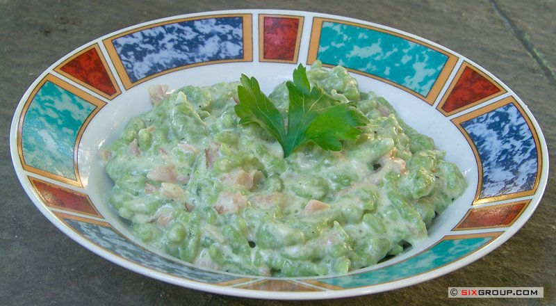 Rohschinken in Streifen schneiden und in Butter anrösten. Sahne und Parmesan dazugeben und mit Salz und Pfeffer abschmecken. Sauce etwas einkochen lassen und die Spatzlen darin schwenken.