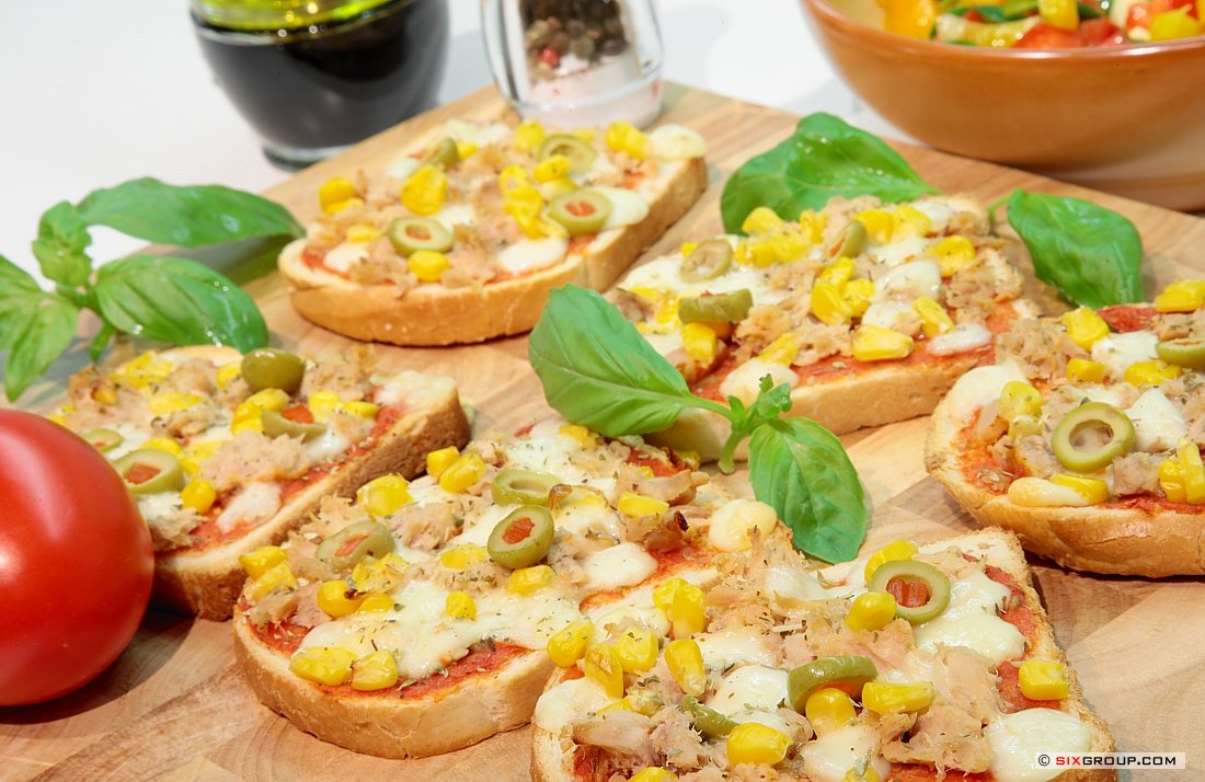 Käse in kleine Würfel schneiden. Oliven in Scheiben. Toastbrot toasten, auf ein mit Backpapier belegtes Backblech geben und mit Tomaten bestreichen. Thunfisch zerpflücken und auf den Toasts verteilen, Mais und Käse darüber und zum Schluß die Oliven. Mit Origano bestreuen.