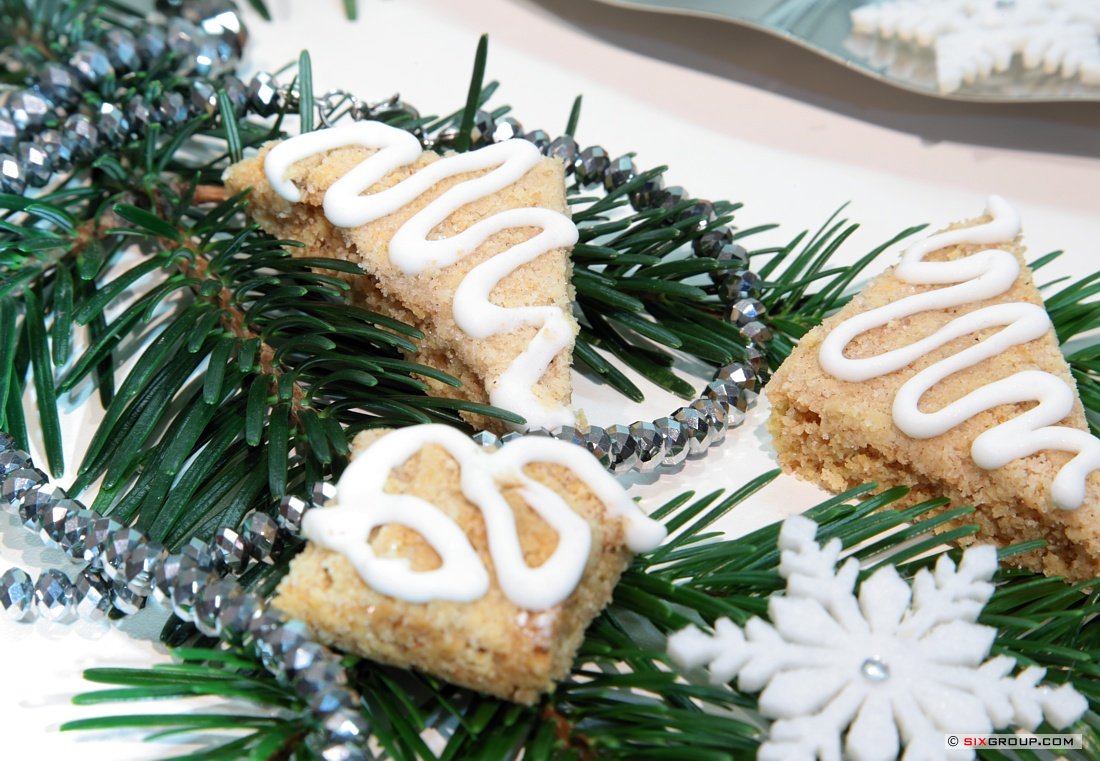 Kuchenplatte in 30ca. 6cm große Quadrate schneiden, dann diese diagonal halbieren und auskühlen lassen.