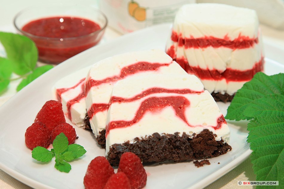 Quark, Salz, 3EL Zitronensaft und 230g Zucker verrühren. Sahne steif schlagen und unter den Quark heben. Himbeeren, bis auf einige zum Verzieren, 2EL Zitronensaft und 3EL Zucker pürieren.